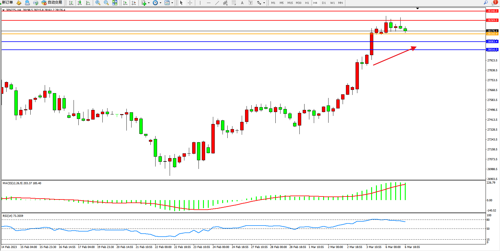 日经指数JPN225——4小时K线图显示: