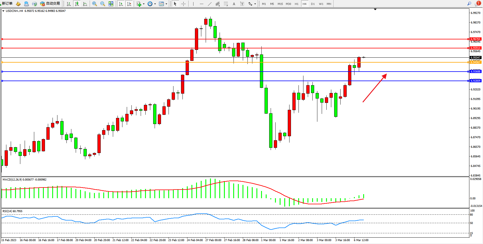 交易策略:6.94567上方看涨,目标6.95914 6.96765