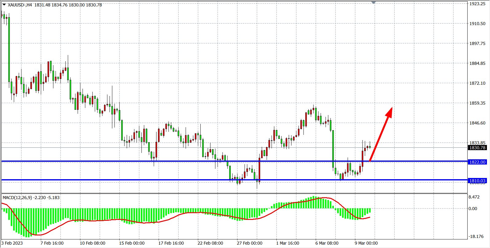 备选策略:在1822.00之下看跌,目标1810.00、1800.00