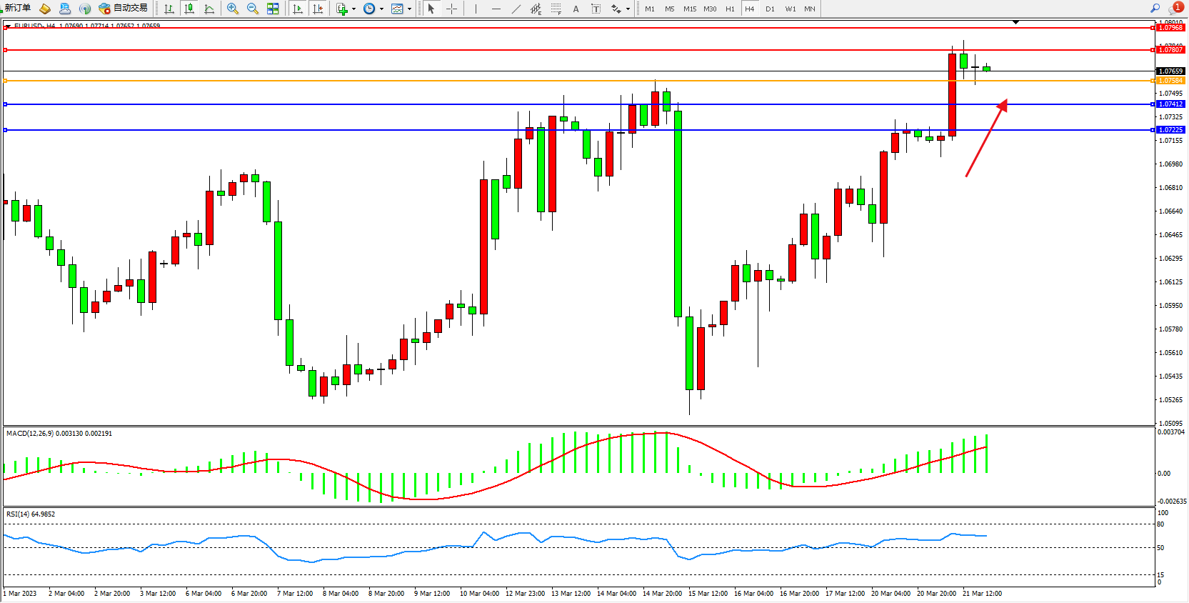 4小时图看:多头动力高位拉升上扬,短期窄幅整理,市场看涨情绪涌现,多头动力有继续攀升态势,MACD指标处于多头区域持续上移,RSI指标处于50均衡线上側弱势整理;