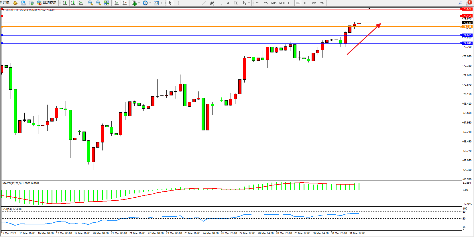 交易策略:75.325上方看涨,目标76.158  76.670