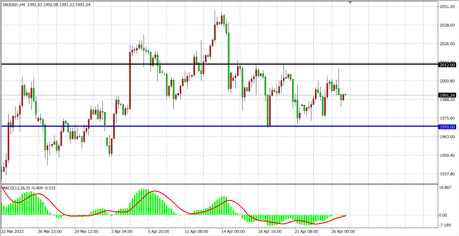 周三(4月26日)有消息称,美国政府目前不愿对第一共和银行采取干预措施,其财报暴雷重燃市场对银行业危机的担忧,导致市场预期美联储5月份加息进一步下降,加上经济数据表明更高的借贷成本和不明朗的经济前景正抑制资本投资,美指下行,现货黄金受到对经济衰退担忧的支撑上涨,但仍受制于下周欧美央行加息前景,出现先涨后跌得国山和行情,最终收跌0.39%。
