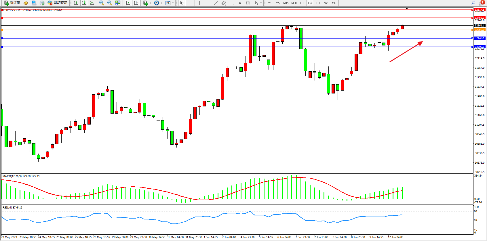 日经指数JPN225——4小时K线图显示: