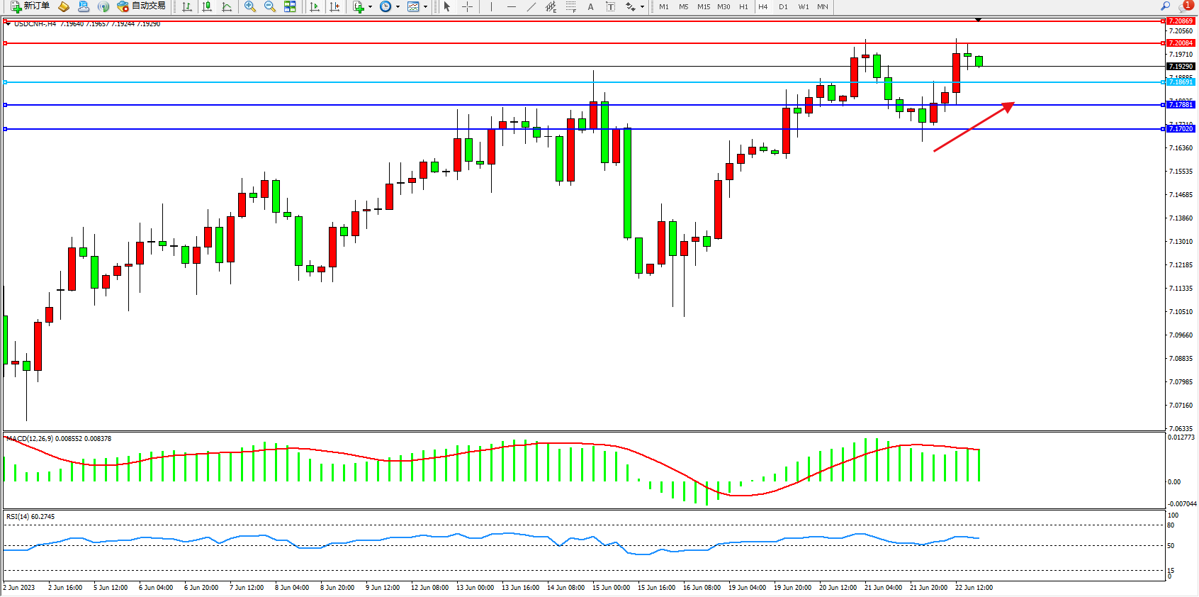 交易策略:7.18691上方看涨,目标7.20084 7.20669