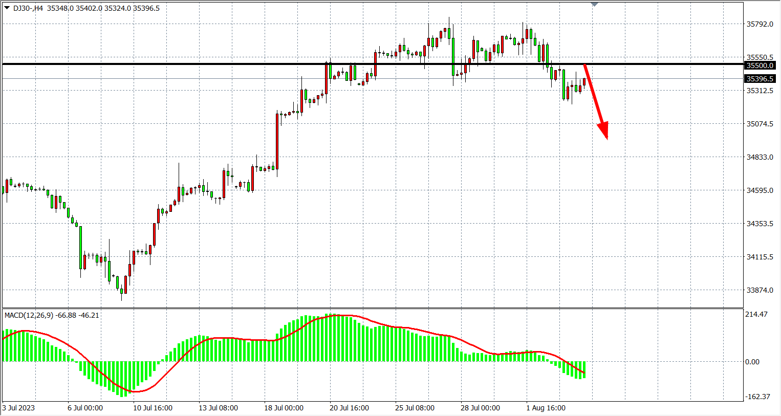 备选策略:35500 下方看跌,目标 35330 35000