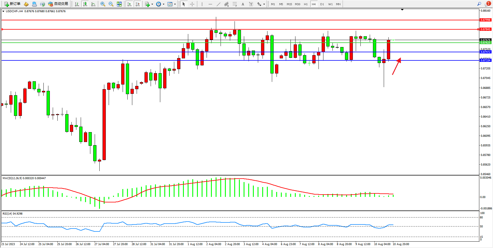 美元瑞郎USDCHF——4小时K线图显示: