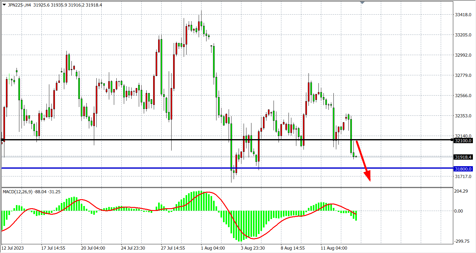 4小时图看,日经指数围绕32000徘徊,MACD量能下穿零轴,多头趋势转弱,支撑关注阻力关注32100-32350。
