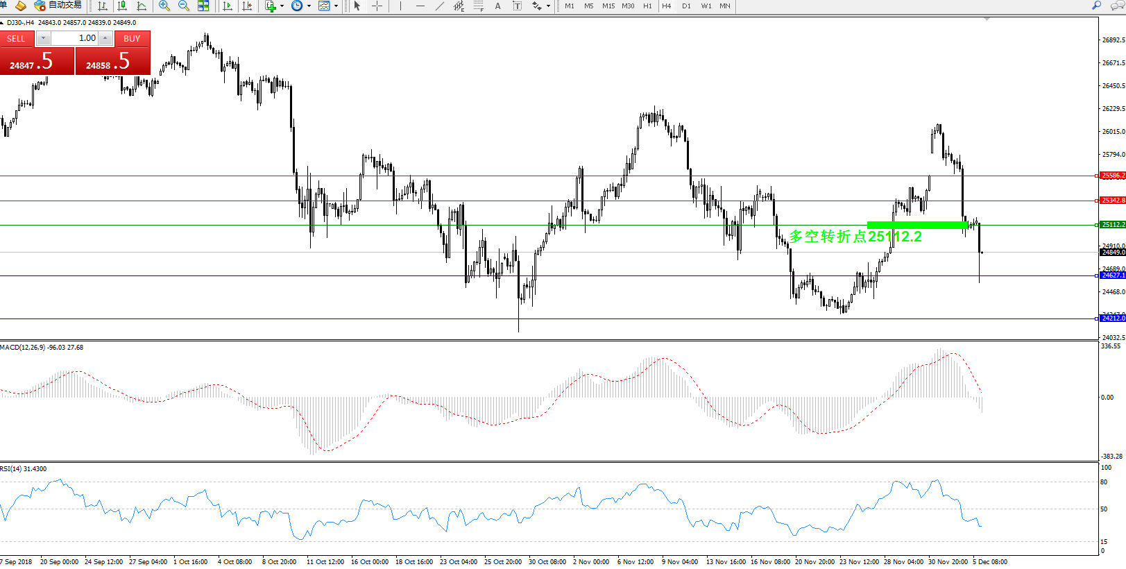 道琼斯指数DJ30—4小时K线图显示:
