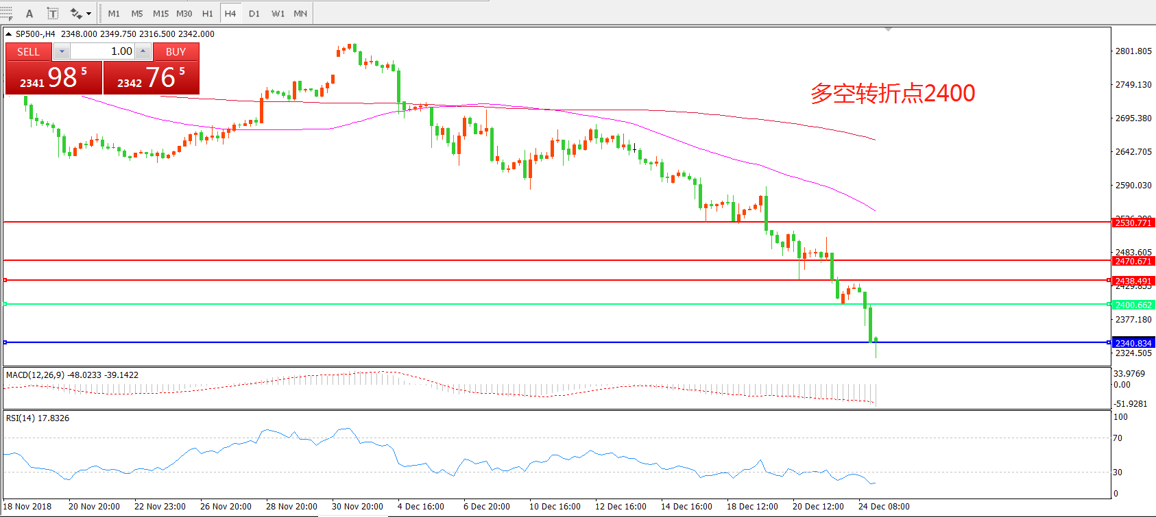 4小时图看,SP500呈现破位下行状态均线系统呈空头排列之, MACD绿柱增加,RSI处于超跌区域,短期有反弹可能,但整体下行走势明显。。