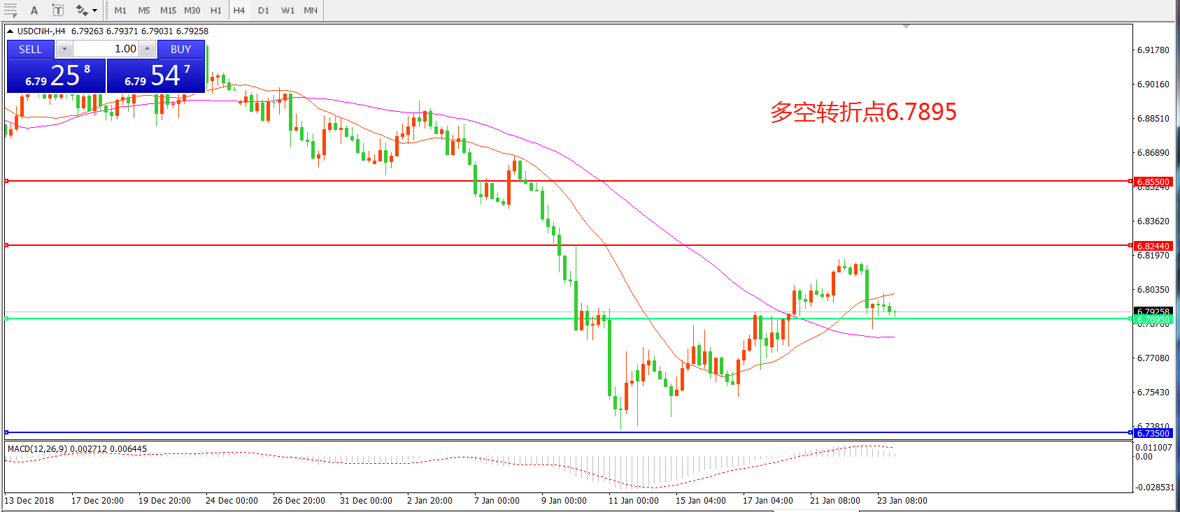 4小时图均线金叉上攻,MACD在0轴上方运行,动能柱放量,企稳6.80重要关口,预计汇价将进一步走高。