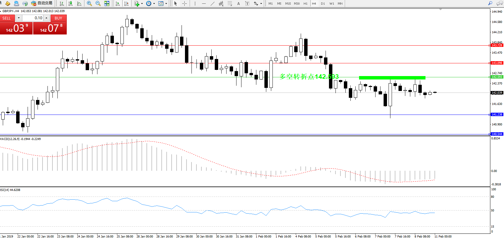 交易策略:142.593下方看跌,目标141.238、140.544