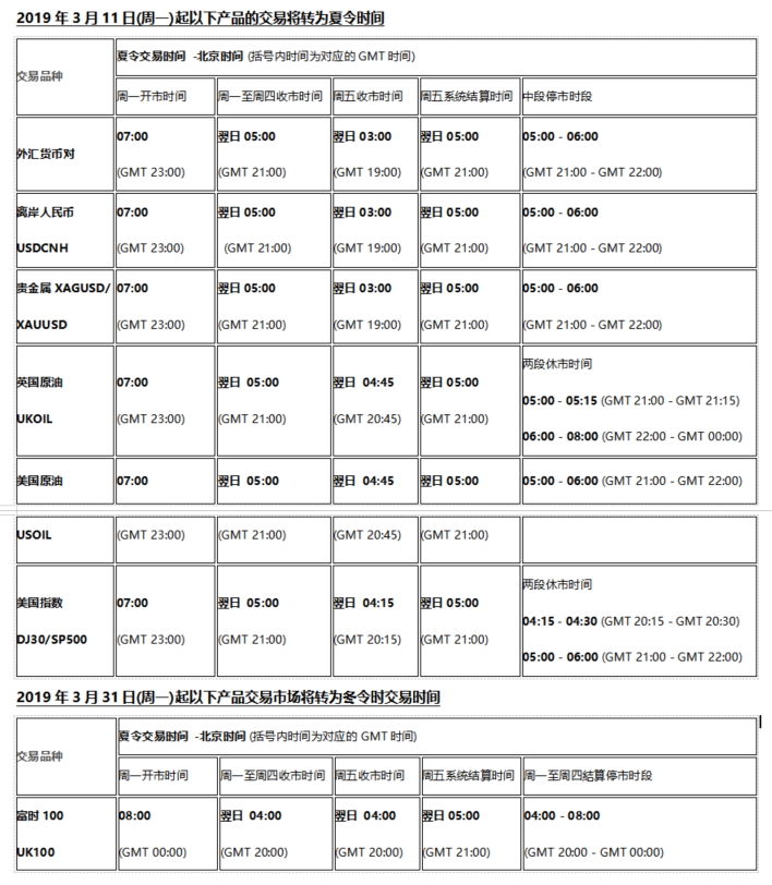 由于北美时区市场于2019年3月10日(周日)及欧洲时区市场于2019年3月31日(周日)开始分别进入夏令时时间, 以下产品交易时间将随时区转变调整为夏令时交易时间(周一开盘时间不变,周二至周四停市结算时间较冬令时提早1小时,周六收盘结算较冬令时提早1小时)敬请留意!