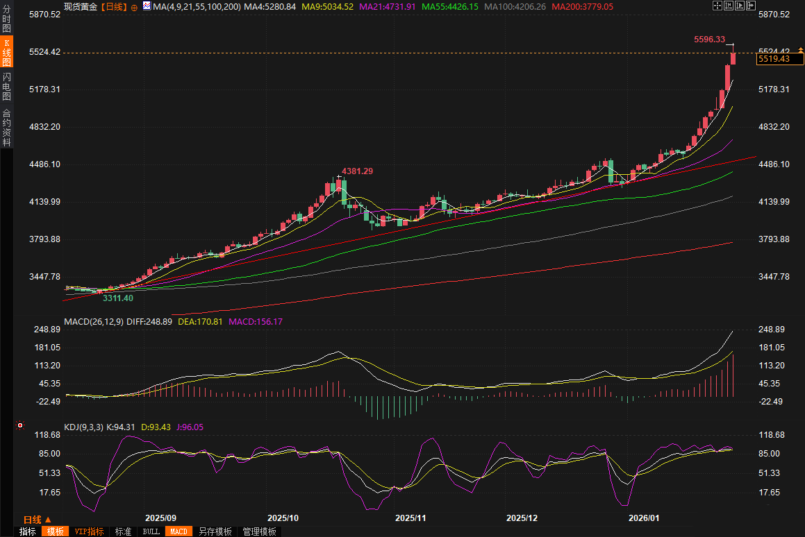 黄金价格的这一轮暴涨可谓势不可挡。现货黄金周三大幅上涨4.5%,收报每盎司5414.87美元,盘中一度触及5418.67美元的历史高点,而周四亚市早盘更是延续涨势,截止08:00,最高冲至5596.33美元,涨幅约3.35%。美国2月期金同样表现出色,周三结算价上涨4.3%至5303.60美元,周四早盘截止08:00,,最高触及5626.8美元,涨幅约5.3%。这一连串数据反映出市场对不确定性的高度敏感,自今年初以来,金价已累计上涨逾20%,延续了去年创纪录的涨势。