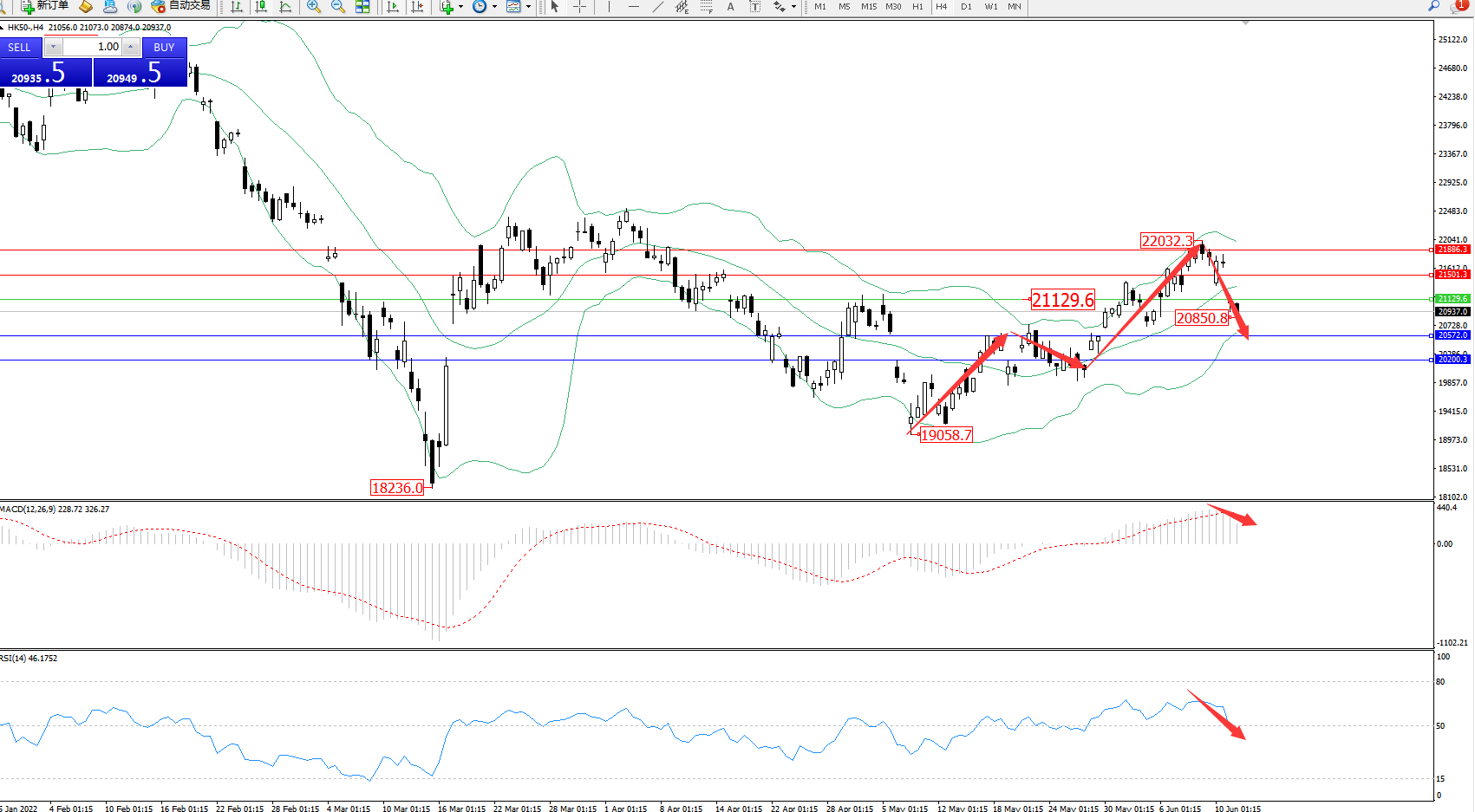 恒指HK50 ——4小时K线图显示: