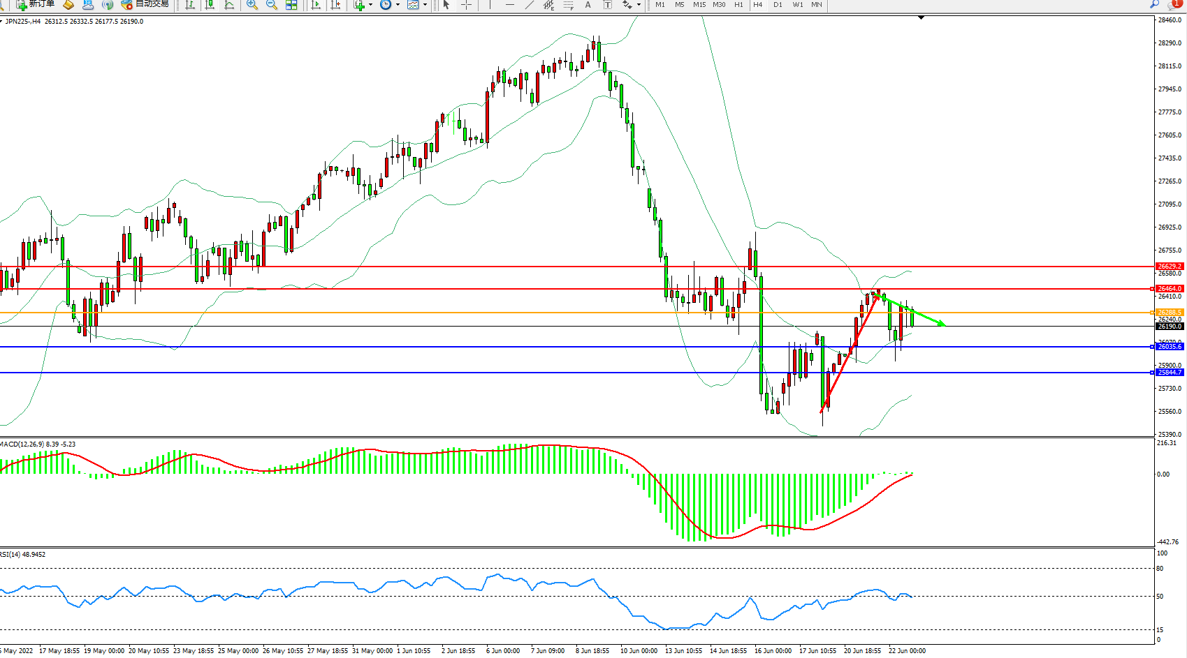 日经225指数6月22日(周三)收盘下跌85.81点,跌幅0.33%,报26160.50点。委员们一致同意,日本央行的立场不变,即在必要时毫不犹豫地采取额外宽松措施,且一位委员表示原材料成本上涨将损害经济,因此必须保持强有力的货币宽松政策。