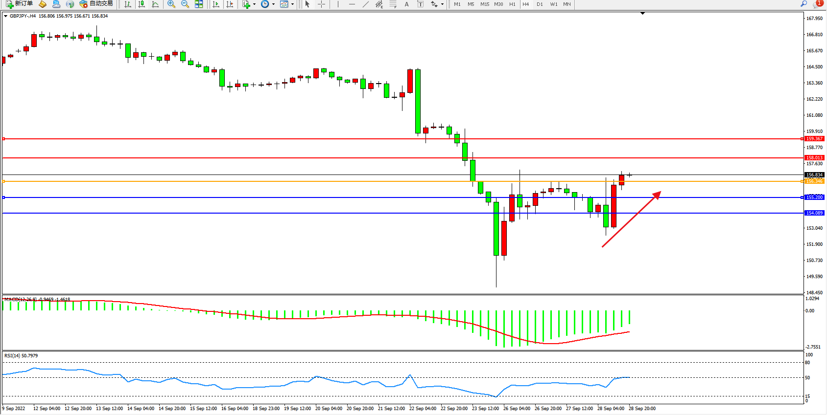 交易策略:156.346上方看涨,目标158.013、159.367