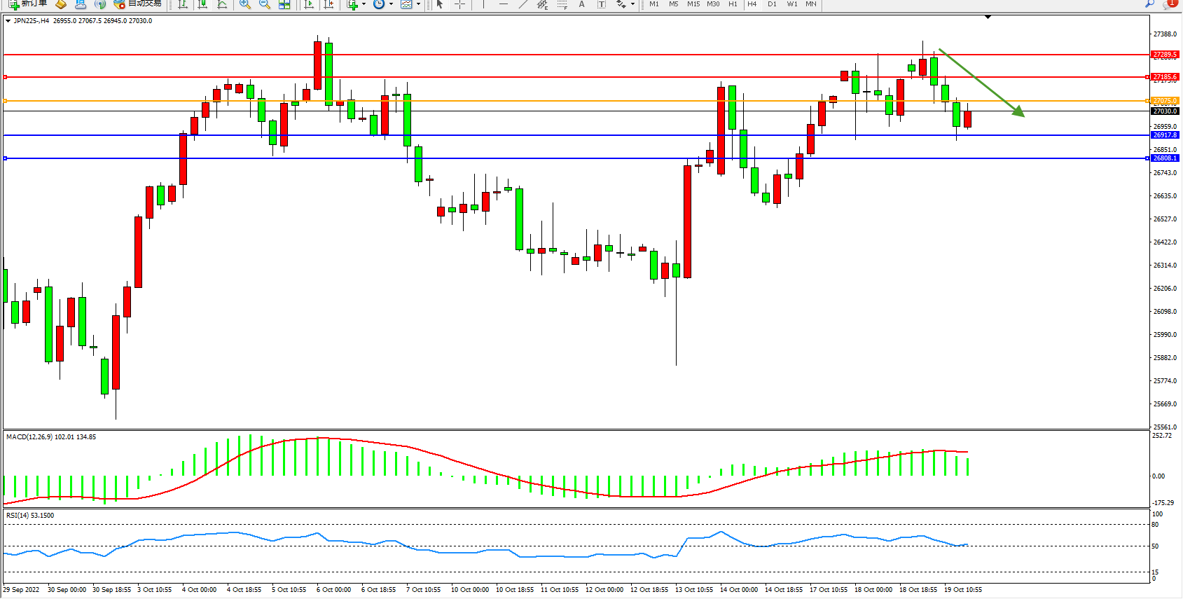 日经指数JPN225——4小时K线图显示: