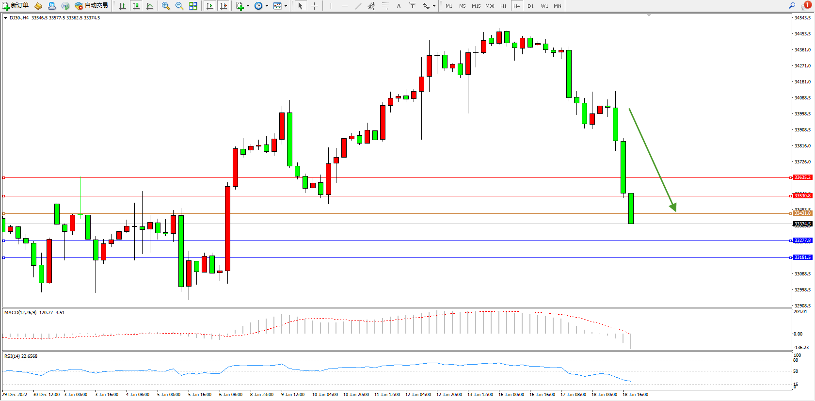 道琼斯指数DJ30——4小时K线图显示: