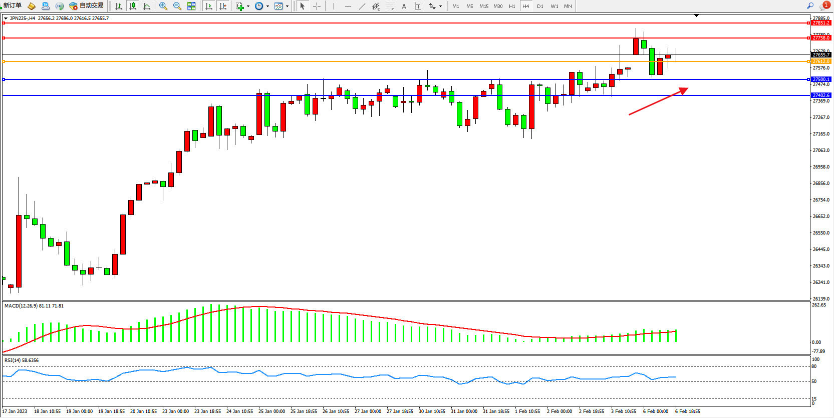 日经指数JPN225——4小时K线图显示: