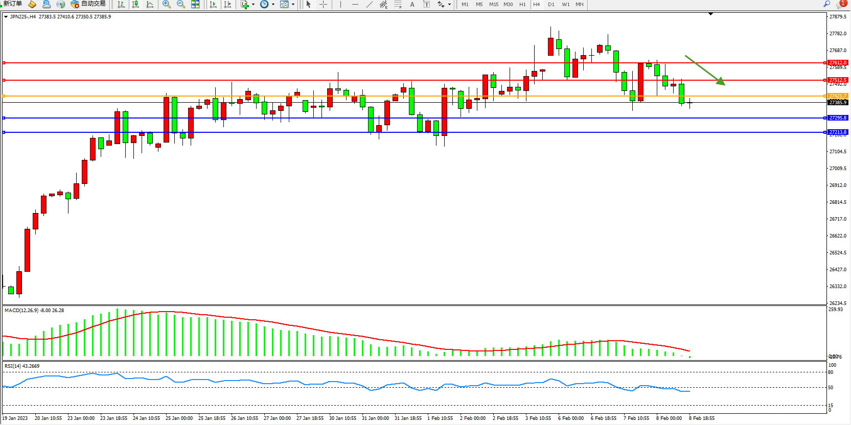 日经指数JPN225——4小时K线图显示: