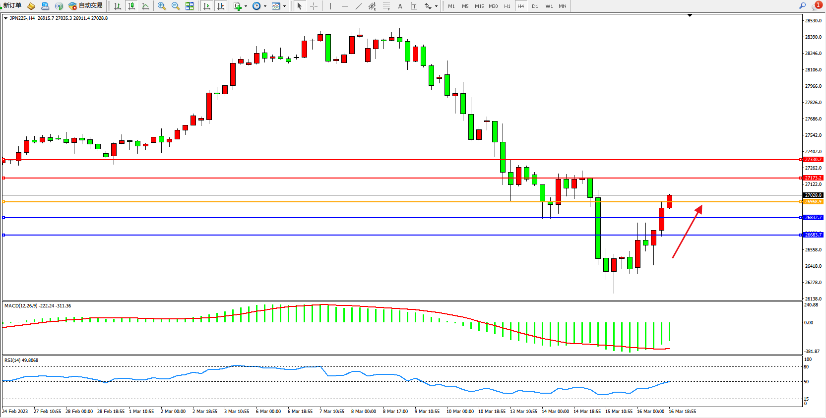 日经指数JPN225——4小时K线图显示:
