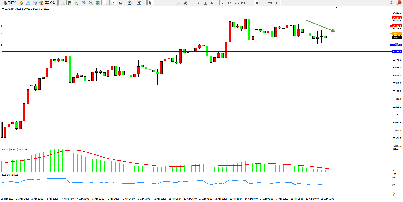 道琼斯指数DJ30——4小时K线图显示: