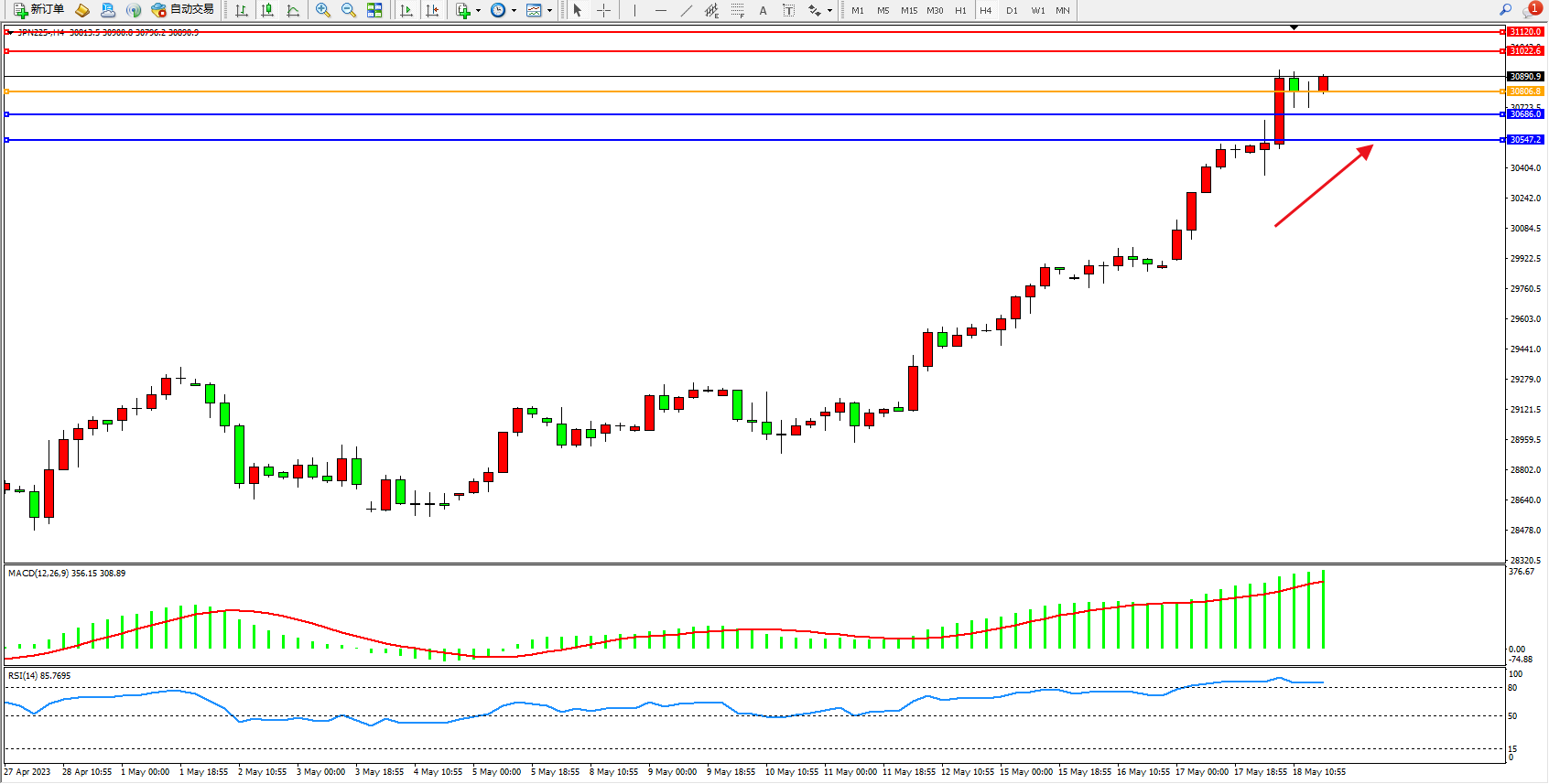 日经指数JPN225——4小时K线图显示: