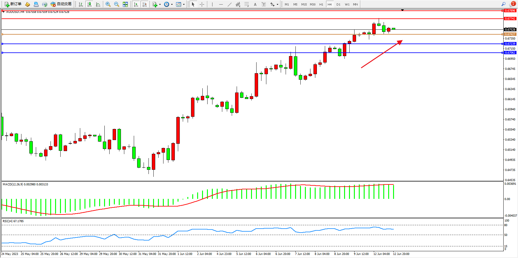 交易策略:0.67427上方看涨,目标0.67742 0.67896