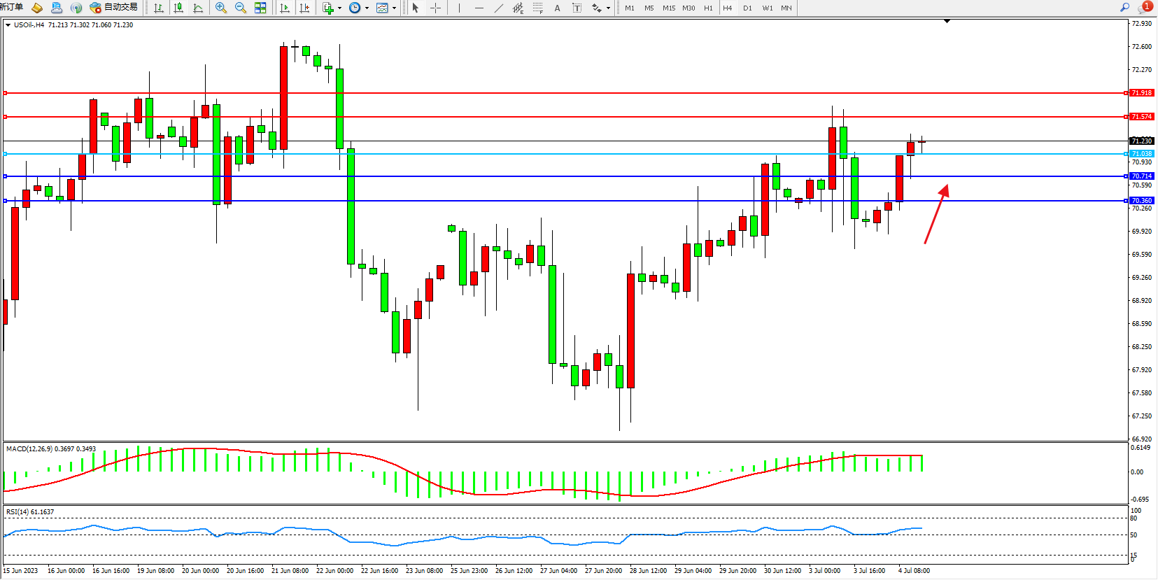 原油USOil——4小时K线图显示: